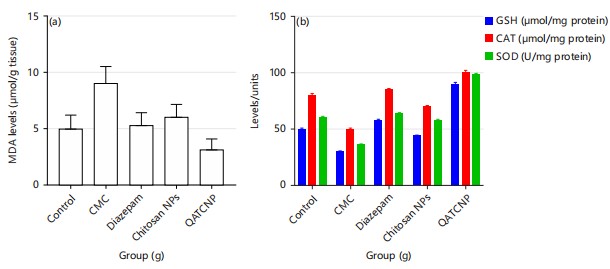 Effects on oxidative stress markers: Figure 3a below shows the MDA levels in the brain tissue. The results revealed that the QATCNP group demonstrates a significant (p<0.05) reduction in MDA levels compared to the CMC-only group, highlighting the antioxidative effect of the treatment. In Fig. 3b, the activities of CAT, SOD and GSH were compared across the different groups. The results show that the QATCNP group exhibits significantly higher activities of these antioxidant enzymes compared to the CMC-only group, indicating enhanced antioxidant defense.