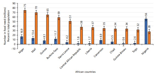 An expanding population: Current global development plans are targeted at reducing extreme poverty. FAO estimate indicates that 870 million people are malnourished, with insufficient resources to purchase or produce adequate food, as shown in Fig. 1. Nigeria has a high percentage of people with food needs, while Guinea-Bissau has the lowest.