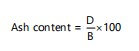 where, B and D represent the weight (g) of the sample after oven-drying at 105°C and the weight (g) of the residue.