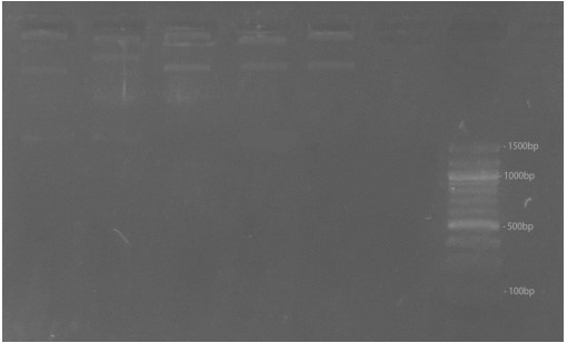 Gel electrophoresis A 5 mL solution of 1x TBE was prepared and 0.75 g of agarose gel was added. The mixture was heated in the microwave on high for 1 min to melt the gel. Ethidium bromide was added to a final concentration of 1:2, (3 ul). The solution was allowed to cool before being poured into a casting tray. Once set, the gel was transferred to a gel tank and covered with 1x TBE buffer. Amplification products (15 ulaliquots) were loaded into the wells and the gel was run at 1V for 3 min. The resulting bands were visualized under UV light using a gel documentation system13.