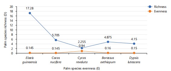 Diversity of palm species: The data in Table 5 represents the relative frequency and relative dominance evaluated for five palm species in two study stations (South-Core and North-Core) axis of Joseph Sarwuan Tarka University. In this study, Cycas nucifera was the most Abundant (29.17), followed by Cocos nucifera (20.83) and Elaeis guineensis (20.83). others include Borassus aethiopum (6.17) and Dypsis lutescens (12.50). Table 6 represents diversity indices evaluated in two stations. Species richness (Magalef) was highest in Elaeis guineensis (28.84) at the South-Core study location, and in the North-Core, highest in Cocos nucifera (6.43). Species dominance (Simpson’s diversity index) was calculated to be highest in Elaeis guineensis (0.43) at South-Core and highest in Cocos nucifera (0.11) at South-Core. Diversity indices (Shannon-Weiner) revealed in South-Core Cycas revoluta (0.29) was the highest, and Cocos nucifera (0.37) at North-Core. Species evenness was recorded equal values at North-Core and the lowest value in Cocos nucifera (0.21) at North-Core. Highest evenness in Cycas revoluta at South Korea. Figure 2 is a linear graph showing the relationship between species richness and evenness among the studied palm species. The richest species represented in the graph was Elaeis guineensis, while the most evenly distributed species was Cycas revoluta.