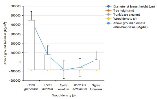 trunk base area, density 2.2 m, and biomass of 249.36 kg/m2. Borassus aethiopum had 21 average of leaves, 8.5 m, tree height 3.32 m, a trunk base 4.4 m, a density 2.2, and biomass of 2.49.36 kg/m2. Dypsis lutescens had 4 average number of leaves, 4.4 m diameter, tree height of 49.28 m, trunk base area of 21.6 m, and a density of 22 cm, biomass 933.93.33 kg/m2. Elaeis guineensis had the highest biomass in this study followed by Borassus aethiopum (213,69.98 kg/m2), the least tree biomass was recorded in Cycas revoluta (249.36 kg/m2). Figure 24; presents a linear graph showing the relationship between morphological characteristics (diameter, tree height, trunk base area, above-ground biomass) and species density of the Palm species studied. The prominent characteristics displayed were only above-ground biomass and species density. Evidently displaying a relationship and possible prediction of the impact of biomass on the density of trees, with Cycas revoluta and Borassus aethiopum having a very close relationship.