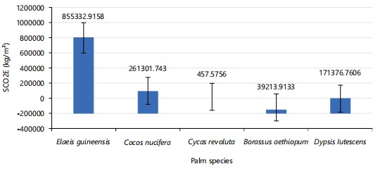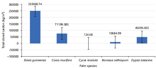 Carbon uptake estimation: Figure 25 shows is a bar chart showing the total sequestered carbon in palm species studied, Elaeis guineensis (233060.74 kg/m2) stored the most organic carbon, followed by Cocos nucifera (71199.39 kg/m2), Dypsis lutescens (46696.67 k g/m2), Borassus aethiopum (10684.99 kg/m2), and Cycas revoluta (124.68 kg/m2), which stored the least quantity of carbon. Figure 26 shows Elaeis guineensis (855332.92 kg/m2) sequestered the most carbon dioxide equivalent, followed by Cocos nucifera (261301.74 kg/m2), Dypsis lutescens (171376.76 kg/m2), Borassus aethiopum (39213.91 kg/m2), and Cycas revoluta (457.76 kg/m2) which sequestered the least quantity of SCO2E recorded.