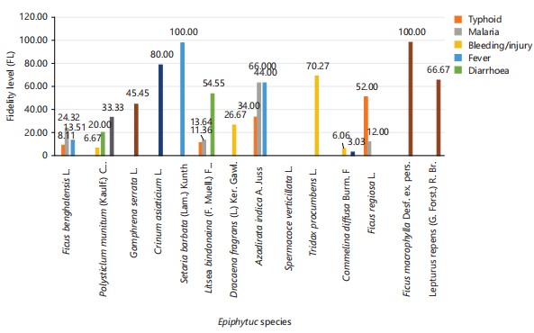 Litsea bindoniana shows a diverse range of uses, particularly for diarrhea (54.55%), malaria (13.64%), and typhoid (11.36%), suggesting versatility across ailments. Dracaena fragrans is most notably used for bleeding or injury treatment, with a 26.67% fidelity level, though it is not applied to other conditions. Azadirachta indica has one of the highest fidelity levels for both malaria and fever, each at 64%, and also shows a 34% fidelity level for typhoid, making it widely trusted for multiple conditions. Tridax procumbens has a 70.27% fidelity level for treating bleeding or injury, highlighting its specialization in this area. Commelina diffusa shows low fidelity for bleeding (6.06%) and stomach ache (3.03%), suggesting it is not highly relied upon for specific ailments.