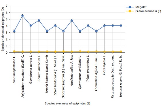 Taxonomic diversity study: The diversity of Palms and Epiphytes was analysed using biodiversity indices such as Shannon-Weiner index (H’) and Simpson’s Diversity index (D), Magalef and Pielou’s evenness. These indices were used to assess species dominance, diversity, richness, and evenness across sampled species9. A comparative analysis of species dominance and distribution on both palm and epiphytes was conducted to determine if tree species and epiphytes interacted within micro-environmental conditions and whether these interactions influenced species abundance and carbon storage.