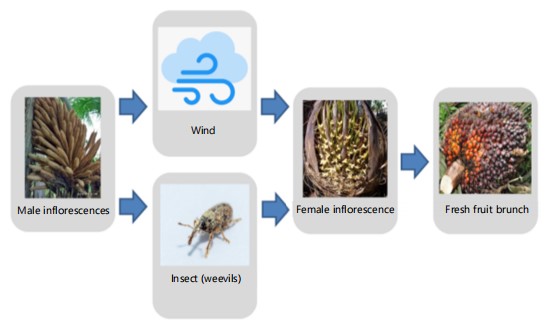 Cross-pollinated by weevils (Elaeidobius kamerunicus); minimal wind role; high success with insect pollinators |