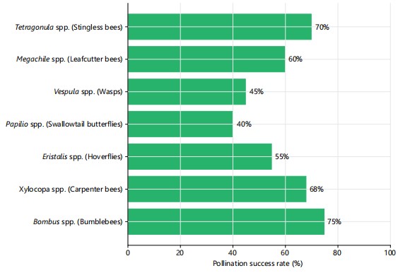 Measurement of pollination efficiency: The evaluation of pollination efficiency usually involves measuring fruit set percentages together with fruit dimensions and seed numbers per fruit, and total yield numbers. Studies indicate that native midges (Forcipomyia spp.) boost cocoa fruit set only when their species exists abundance in natural habitats25. Stingless bees alongside sweat bees benefit cashew flower pollination because they contribute to superior seed quality, together with increased nut sizes7. Under favorable conditions Elaeidobius kamerunicus weevils enhance the fruit bunch weight and oil yield in oil palm while providing effective pollination services.