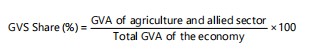 GVA Share: This variable represents the percentage contribution of the Agriculture and Allied sectors to the Gross Value Added (GVA) of the entire economy. It was calculated using the formula13: