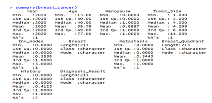 Figure 1 shows the summary statistics of the data. There are missing values in the year, tumor size, invasive nodes, metastasis, and history columns. The missing values were removed, so that the data is ready to work with.