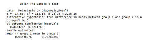 Figure 10 shows the result of a Welch Two-Sample t-test, use in testing whether there is a statistically significant difference in metastasis rates between women diagnosed with benign and malignant tumors. R software version 4.4.2 was used for this analysis.
