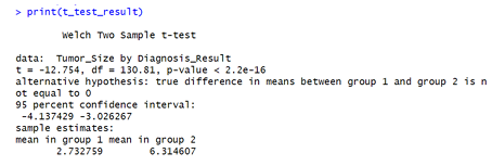 (Ho): Mean tumor sizes are equal in both groups (benign vs. malignant). Since the p-value is far below any conventional threshold 0.05, we reject the null hypothesis.
