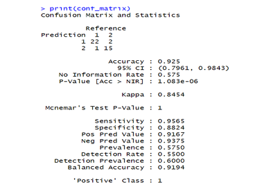 Figure 13 is a confusion matrix for the random forest model. The package “random forest” on R software version 4.4.2 was used to perform the analysis. The model performs exceptionally well with an accuracy greater than 90 percent and a kappa value of 84.54%. it detects positives and negatives reliably, without being heavily biased toward one class. Very low error rates and statistically highly significant results.