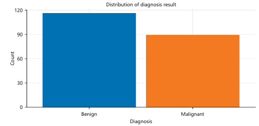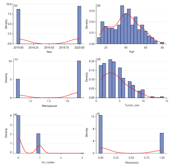 The analysis began with preprocessing steps, including the removal of missing values across key variables such as year, tumor size, invasive lymph nodes, metastasis, and family history. Descriptive statistics revealed that the dataset consisted of more benign cases (117) than malignant ones (90). The distribution of patient age at diagnosis was unimodal and slightly right-skewed, with a peak between 45 and 55 years, indicating that most diagnoses occurred in middle-aged women. Tumor size and lymph node involvement also showed right-skewed distributions, with most tumors being small and minimal lymphatic spread in early-stage cases. However, malignant tumors tended to be larger and occurred more frequently among older women confirming the research and results5,12,16,17.
