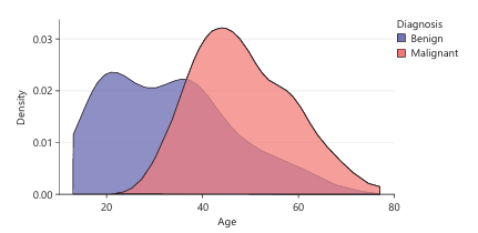 Figure 4 is a density plot that shows the distribution of ages among two groups of women based on their cancer diagnosis: Benign and Malignant. It allows us to compare how age is associated with the likelihood of having a benign or malignant diagnosis. Most benign cases occur in younger women, largely between 20 to 45 but very few benign cases occur after age 60. The benign cases peaks around early 30s to mid-30s. the red area extends further to the right, indicating more malignant cases in older women, especially between 45 to 70. It peaks around mid-40s to early 50s. There is some overlap between the groups around age 40, suggesting this is a transitional age where both benign and malignant diagnoses are common.