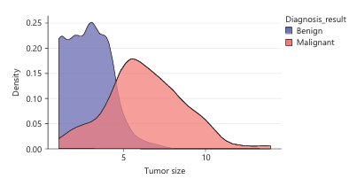 Figure 5 is a density plot comparing the tumor size distributions of women with benign and malignant diagnoses. It helps us understand how tumor size is related to the likelihood of having cancer. For benign tumor, peak density occurs at small tumor sizes, approximately between 1 and 3. The curve drops off significantly after 4-5, indicating that larger benign tumors are rare. Malignant tumors start to increase around 2-3, with a peak between 5 and 6. It tend to be larger, with a broader and flatter distribution extending beyond 10. This indicates a higher likelihood of malignancy as tumor size increases. There is a moderate overlap around tumor size 2 to 5, where both benign and malignant cases occur. Beyond size 5, the chances of a tumor being malignant increases sharply.