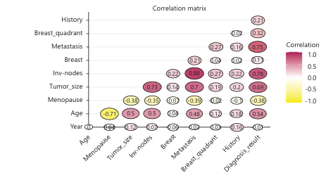 Figure 6 helps to identify how variables are linearly related to one another. Invasive nodes, metastasis and tumor size have a very strong influences on diagnosis result. They are medically significant because they relate to cancer progression. Meanwhile, age, year and breast quadrant have a minimal impact based on linear correlation alone.