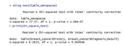 Figure 7 is a Chi-square analysis of history and diagnosis result using stats package in R software version 4.4.2. It shows that there is strong evidence to suggest that a patient’s family history of breast cancer is significantly associated with the diagnosis result (malignant or benign). Even though in the earlier correlation matrix we saw only a small correlation between History and Diagnosis_Result (0.32), this Chi-square test shows that the association is statistically significant, though not necessarily strong in effect size.