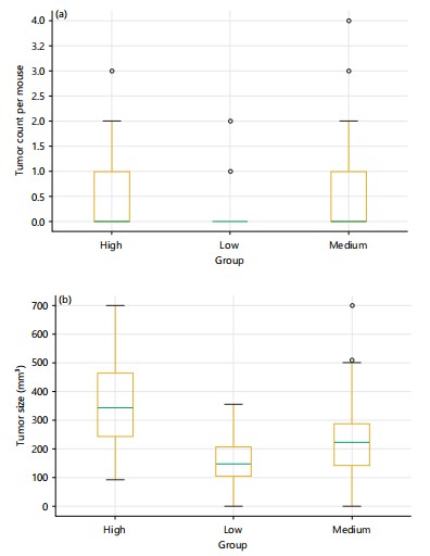 Tumour burden and multiplicity: Mice with elevated polygenic risk developed more numerous and rapidly expanding tumours. Mixed-effects regression (Table 3) showed that each 1-SD increase in aPRS was associated with a 42% rise in tumour multiplicity (IRR = 1.42, 95% CI: 1.21–1.67, p<0.001) and a faster growth trajectory (β = 0.85 mm+/day, 95% CI: 0.45-1.25, p<0.001). Endpoint tumour volumes averaged 320 mm³ in high-aPRS mice compared with 150 mm³ in the low group. Box plots and longitudinal trajectories (Fig. 3a-b) highlight the magnitude of these differences.
