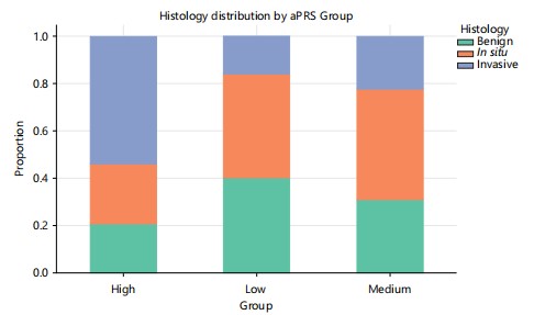 Histopathological progression: The distribution of lesion types shifted markedly with polygenic risk (Fig. 4). While only 14.1% of lesions in low-aPRS mice were invasive, more than half (54.2%) of lesions in high-aPRS animals showed invasive features. Logistic regression confirmed that each 1-SD increment in aPRS significantly increased the odds of invasive carcinoma (OR = 1.72, 95% CI: 1.35-2.19, p = 3.2×10 ; Table 4). Representative histological images (Supplementary Fig. S1) illustrate higher grade and invasive morphology in high-aPRS tumours.