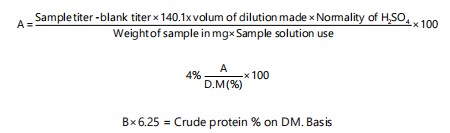 Determination of crude protein in poultry waste: The 0.5 g sample were weighed and then put it in Kjeldahl flask and 2 spoons (2-3 g) of digestion mixture in it. The 10 mL of H2SO4 added in it. Boiled it for 30 min until the color changed to green. The digestive samples were cooled. Added distilled water. And made it 100 mL in a volumetric flask. The 25 mL sample (in duplicate) was taken in a distillation flask. The 50 mL distilled water was added to it. The 15-20 mL NaOH solutions (40%) were added and placed in a heater. Then, 10 mL of boric acid reagent was placed in the receiving flask. The color of the boric acid reagent was changed during distillation. Titrated it against 0.02N H2SO4 solution and noted the titration reading.