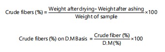 Determination of crude fiber in poultry wastes: The 2 g of samples were weighed and poured into a tall beaker. The 100 mL of (0.15M) H2SO4 was added to it. Some glass beads were added to facilitate quick boiling and then heated for 5 min. The heat supply was adjusted. Reflux exactly for 30 min. The 50 mL of 1.5 M NaOH solution was quickly added and boiled for 35 min. The hot solution was filtered over the crucible and the beaker with hot water. The filtrate was washed with 50 mL of 3M HCL solution. Again, it was washed with hot distilled water until free of acid. Rinse with 10mL acetone. Dried the crucibles with contents in the oven at 135°C for 2 hrs. Allowed to cool in desiccators and weighed. The crucible was placed in the Muffle Furnace for 2 hrs at 550°C. Allowed to cool in desiccators and weighed.